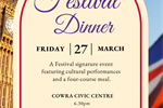 Official Festival of International Understanding Dinner 2026 27 Mar 2026 Welcome to the 61st Festival of International Understanding with 2026 guest nation, United Kingdom. Hosted by your 2026 Youth Ambassadors. Entertainment to be announced soon! 4-course meal catered by our platinum sponsor, Club Cowra.Please Note - Tickets need to be purchased no later than Monday 17th March at 4pm. This is to allow ample time for catering adjustments and to allocate seating. Cowra Civic Centre, 104 Darling Street, Cowra NSW, Cowra 2794 Tagged as: , Live
